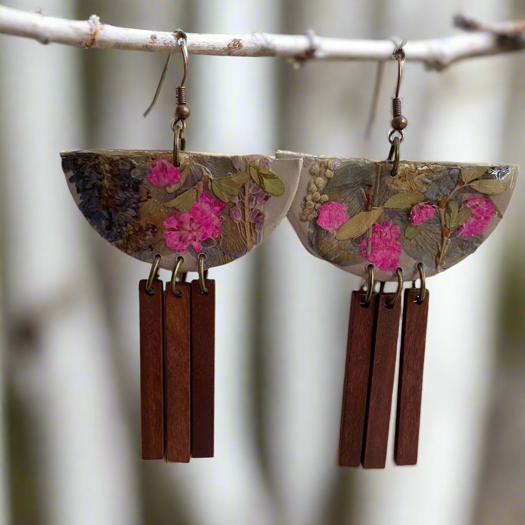 Floral Large Stone Gray Pink Multi Polymer Clay Halfmoon Shape Wood Fringe Bronze Hardware Dangle Earrings