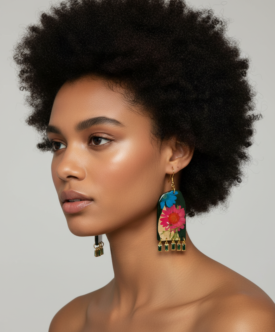 Navy Blue Polymer Clay Organic Arch Shape Red Green Blue Cream Multi Color Dangle Floral Flower Green Gem Fringe