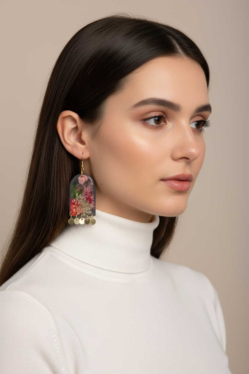 Bloom into bold style with this one-of-a-kind statement earring! Handcrafted from organic grey polymer clay, each arch features an eye-catching brass disc fringe that catches the light beautifully. Adorned with vibrant reds and pinks, these floral-inspired beauties bring a playful pop of color to any outfit. Perfect for anyone who loves artisan jewelry with personality—lightweight, unique, and ready to turn heads.