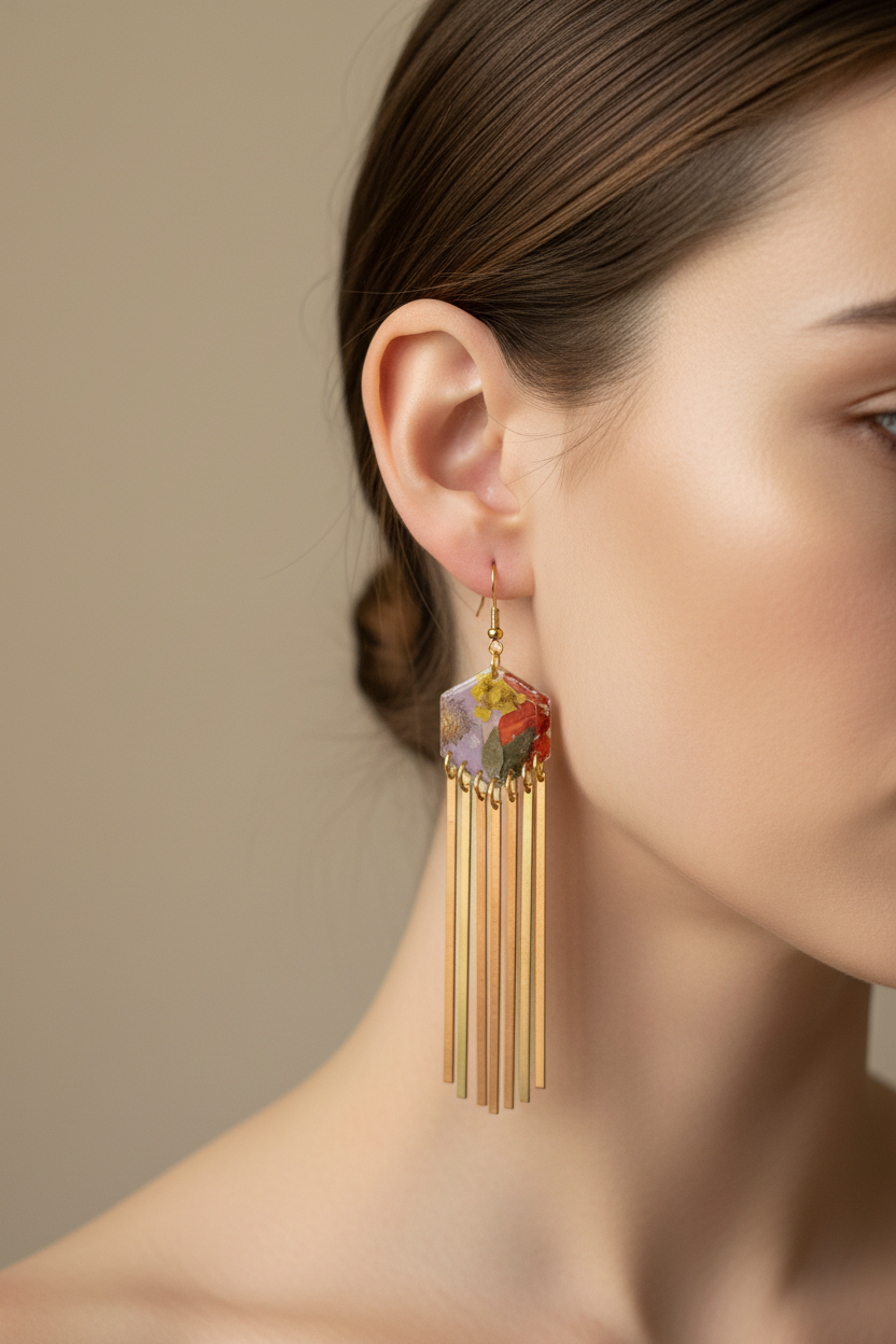 Dare to make a statement with these bold hexagon dangles that fuse delicate floral polymer clay with edgy brass fringe hardware. Each piece captures intricate botanical details in crisp white, suspended from gleaming brass accents that catch the light with every movement. Perfect for those who refuse to play it safe—these earrings blend feminine artistry with an unapologetic edge. Lightweight yet striking, they're designed for anyone bold enough to stand out.