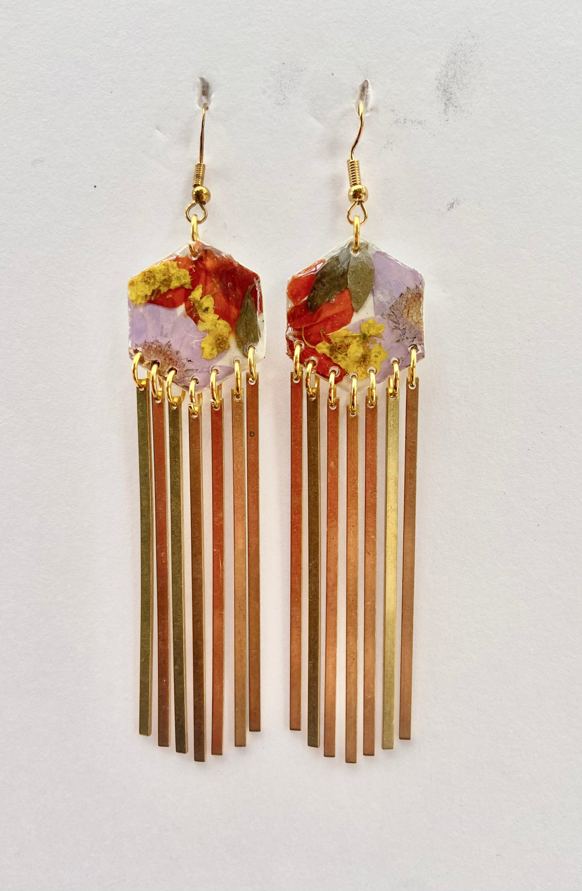 Hexagon dangle polymer clay with brass fringe dangle hardware.
