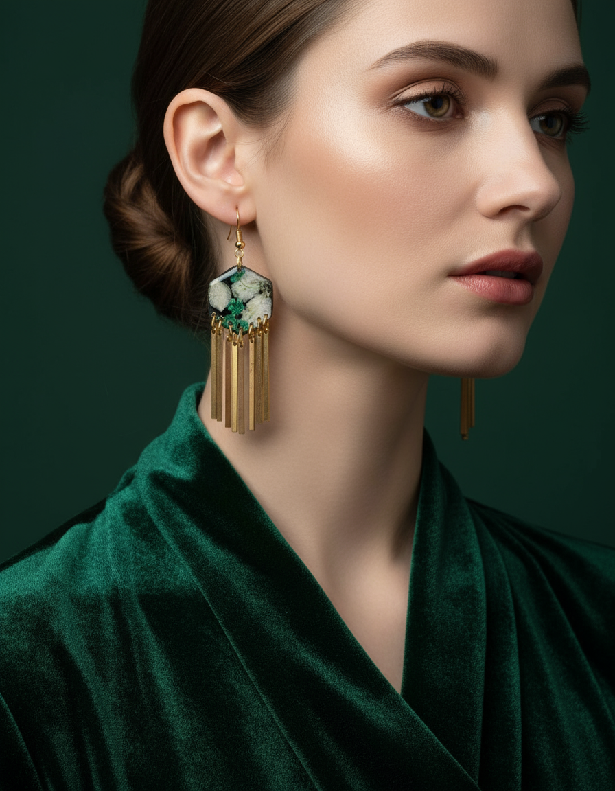 Elevate your jewelry collection with this striking hexagon pendant that seamlessly blends sculptural design with organic beauty. Hand-sculpted polymer clay flowers nestle within a geometric frame, finished with graceful brass fringe that moves fluidly with you. This versatile piece transcends occasions—wear it to add sophistication to your daily routine or let it be the showstopper at special events. The combination of durable materials and meticulous craftsmanship ensures lasting quality and visual impact. If you're seeking jewelry that tells a story and reflects your distinctive style, this is the statement piece you've been waiting for.